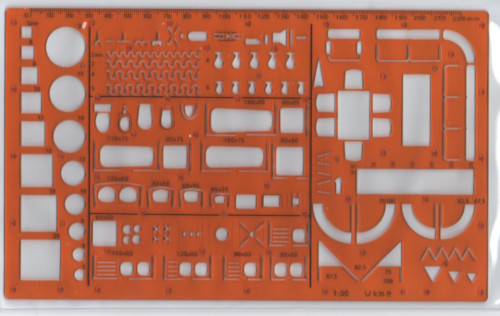 Stencil for civil engineering / architecture drawings. It has all the bathroom and kitchen fittings, furniture and door openings in scale 1:50.